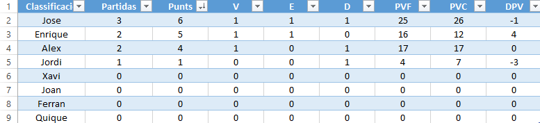 Una vez concluida la partida, el ganador obtendrá 3 puntos y el perdedor 1, en caso de empate ambos jugadores obtendrán dos puntos. Al mismo tiempo, se deberán contabilizar los puntos de victoria obtenidos en la partida, que se irán acumulando a lo largo de la liga (como los goles a favor en la liga de fútbol). En caso de que en la clasificación se produzca un empate, el jugador con más puntos de victoria acumulados, será el que se coloque en un puesto superior de la tabla.